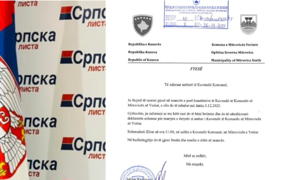 Lista Serbe Ă«shtĂ« tĂ«rhequr pas ftesĂ«s pĂ«r seancĂ«n konstituive tĂ« MitrovicĂ«s sĂ« Veriut, pasi dokumenti fillestar nuk pĂ«rmbante shĂ«nimin zyrtar âRepublika e KosovĂ«sâ.