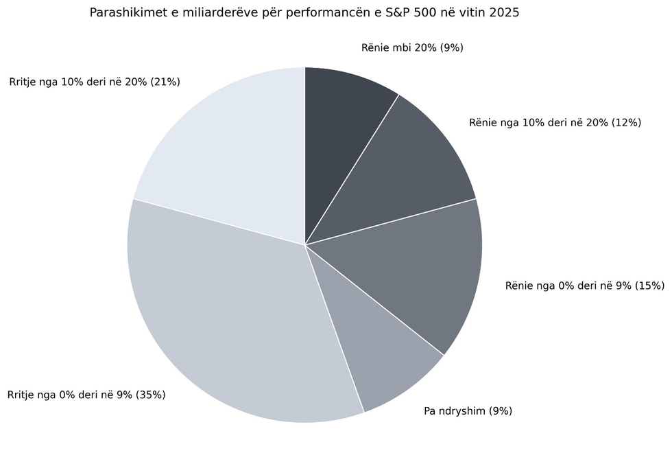 S&P 500 e mbylli vitin me një rritje prej 16%. Ky është një kthim mbi mesataren për indeksin, i cili historikisht ka shënuar rreth 10% rritje vjetore gjatë shtatë dekadave të fundit, megjithëse më i ulët se 23% dhe 24% në vitet 2024 dhe 2023, respektivisht. Megjithatë, miliarderët ishin më pak optimistë. Gati gjysma mendonin se tregu do të ishte i qëndrueshëm ose në rënie në vitin 2025. Një tjetër 35%, grupi më i madh nga të gjithë, parashikuan rritje, por vetëm me shifra një-shifrore. Vetëm 7 nga 34 miliarderët e anketuar, ose 21%, e parashikuan saktë që S&P do ta mbyllte vitin me një rritje midis 10% dhe 20%.