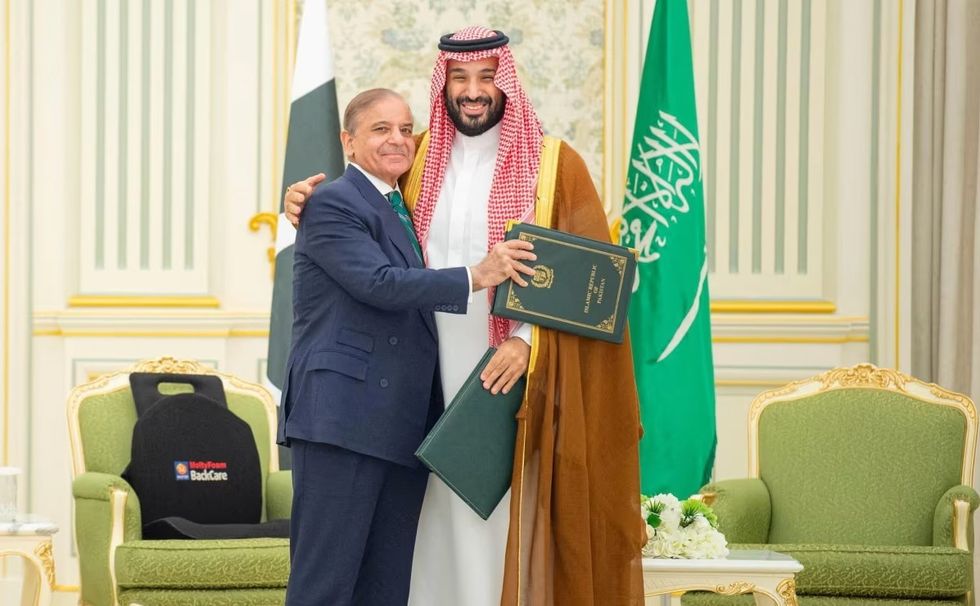 Kryeministri pakistanez Shehbaz Sharif, plot gëzim - i pritur me aeroplanë luftarakë sauditë F-15, një qilim të kuq dhe protokoll të plotë mbretëror - iu bashkua Princit të Kurorës Saudite, Mohammed bin Salman të mërkurën për të nënshkruar një "marrëveshje strategjike të mbrojtjes së ndërsjellë" (SMDA).