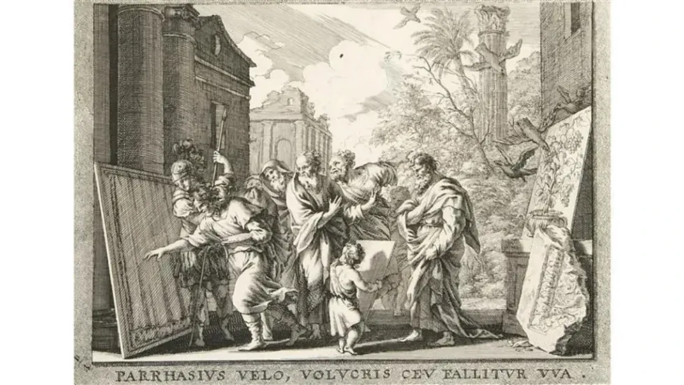 Rreth vitit 400 para Krishtit, dy piktorë legjendarë, Zeuksisi dhe Parasi, u përballën kokë më kokë në një garë për të përcaktuar njëherë e mirë se cili ishte mjeshtri më i madh. Për pjesëmarrjen e tij, Zeuksisi pikturoi një kalavesh rrushi. Sipas autorit romak, Plini Plaku, ky kalavesh vezullues ishte aq bindës saqë zogjtë u hodhën që ta çukitnin portretizimin e bukur të frutave me vesë. Por, kur vetë Zeuksisi u përpoq të tërhiqte një perde - e cila ishte thjesht një iluzion i pikturuar me mjeshtëri edhe më të madhe nga Parasi - u bë e qartë se kush kishte fituar. Mësimi i nxjerrë? Nëse ke dëshirë të fitosh, duhet të mashtrosh mashtruesin.