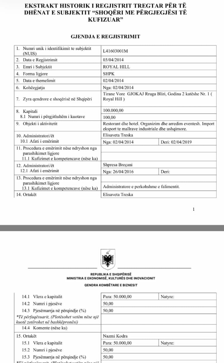 Sipas dokumenteve zyrtare tĂ« QendrĂ«s KombĂ«tare tĂ« Biznesit (QKB), Elisaveta Treska, rezulton tĂ« jetĂ« pronare e “ROYAL HILL” njĂ« resorti eventesh nĂ« VorĂ«.
