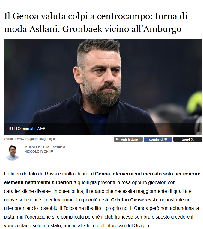 Në këto ditë të fundit të merkatos, gjithnjë sipas mediave italiane, Genoa mbetet opsioni i fundit, kjo pasi De Rossi ka shprehur pëlqimin e tij për Asllanin.