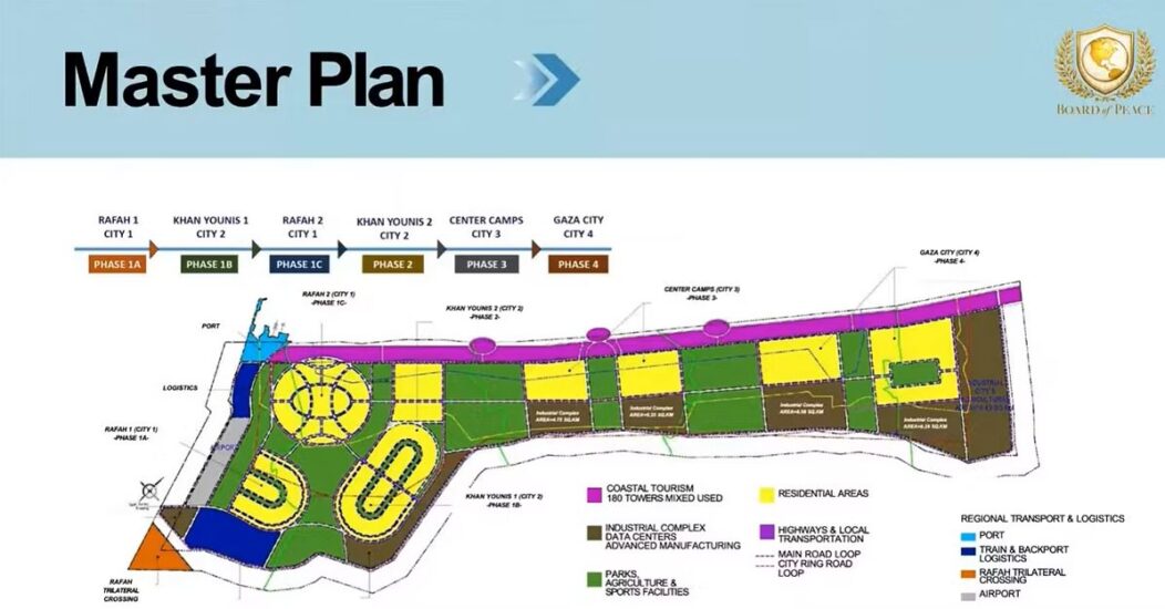 Projektet e Rafah dhe Khan Younis – Plani gjithëpërfshirës i rindërtimit do të kryhej në katër faza kryesore. Fillimisht, pjesë të mëdha të Rafah dhe Khan Younis do të rindërtoheshin me ndërtimin e zonave të mëdha banimi dhe industriale (duke përfshirë qendrat e të dhënave), parqeve dhe objekteve sportive, autostradave dhe rrjeteve hekurudhore.