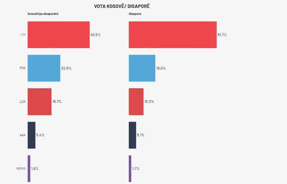 Lëvizja Vetëvendosje (VV) kryeson bindshëm si brenda Kosovës ashtu edhe në diasporë. Në Kosovë (pa diasporën), VV ka marrë 43.5% të votave, ndërsa në diasporë përqindja e saj arrin në 61.7%, duke shënuar një mbështetje dukshëm më të lartë nga mërgata.