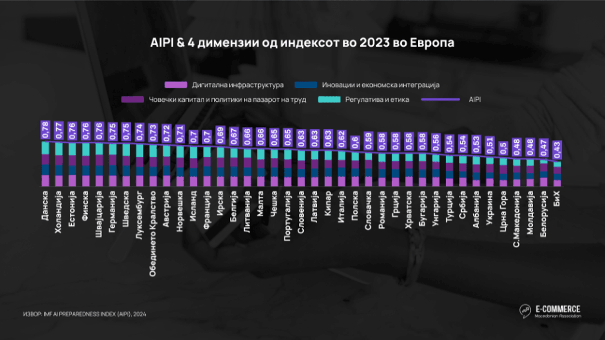 Me një rezultat prej 0.48, Maqedonia e Veriut mbetet ndjeshëm prapa jo vetëm mesatares së BE-së, por edhe tregjeve të Ballkanit, d.m.th. ajo ka një AIPI më të mirë vetëm se Bosnja dhe Hercegovina. Udhëheqësit evropianë si Danimarka, Holanda dhe Estonia tregojnë gatishmëri me një indeks mbi 0.76. Kjo tregon se ekosistemi i biznesit ende nuk ka kapacitet të mjaftueshëm për të shfrytëzuar plotësisht inteligjencën artificiale në tregtinë elektronike për personalizim, automatizim, analizë të të dhënave, logjistikë dhe menaxhim të riskut", thuhet në njoftim.