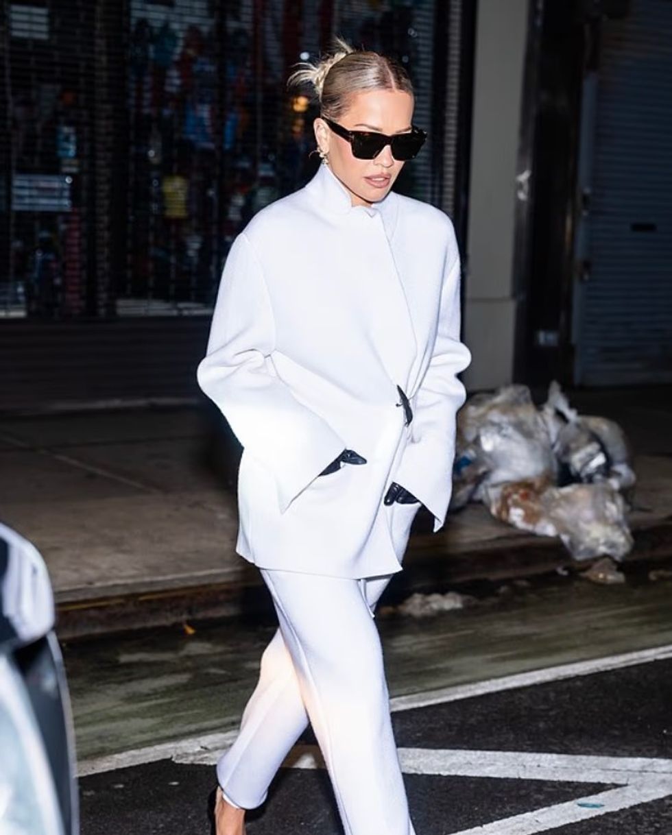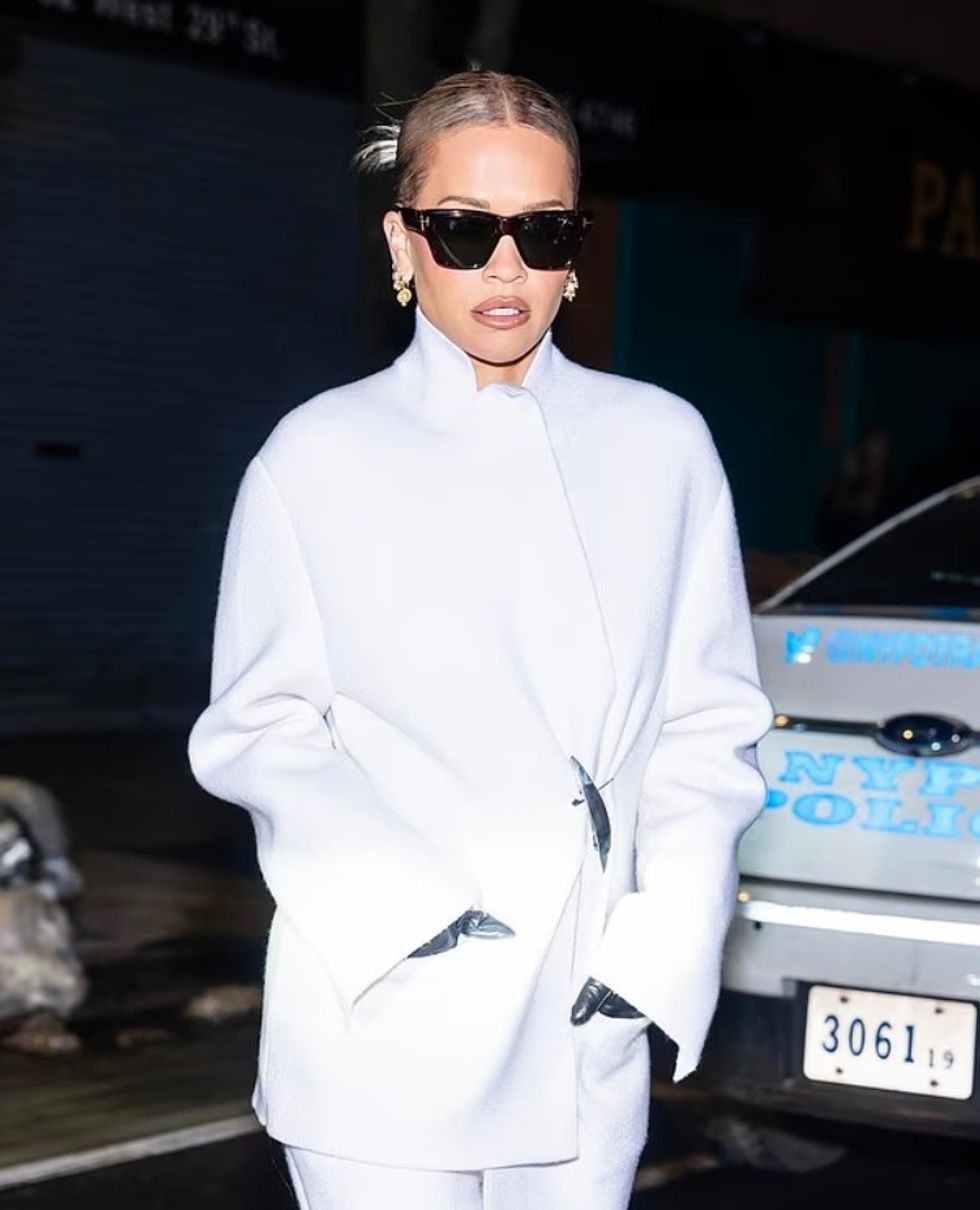 Më vonë, Rita veshi një kostum të bardhë elegant me xhaketë të rrumbullakët dhe pantallona me pranga në kyçin e këmbës, duke e kompletuar dukjen me taka të zeza, doreza lëkure, syze dielli dhe vathë ari.