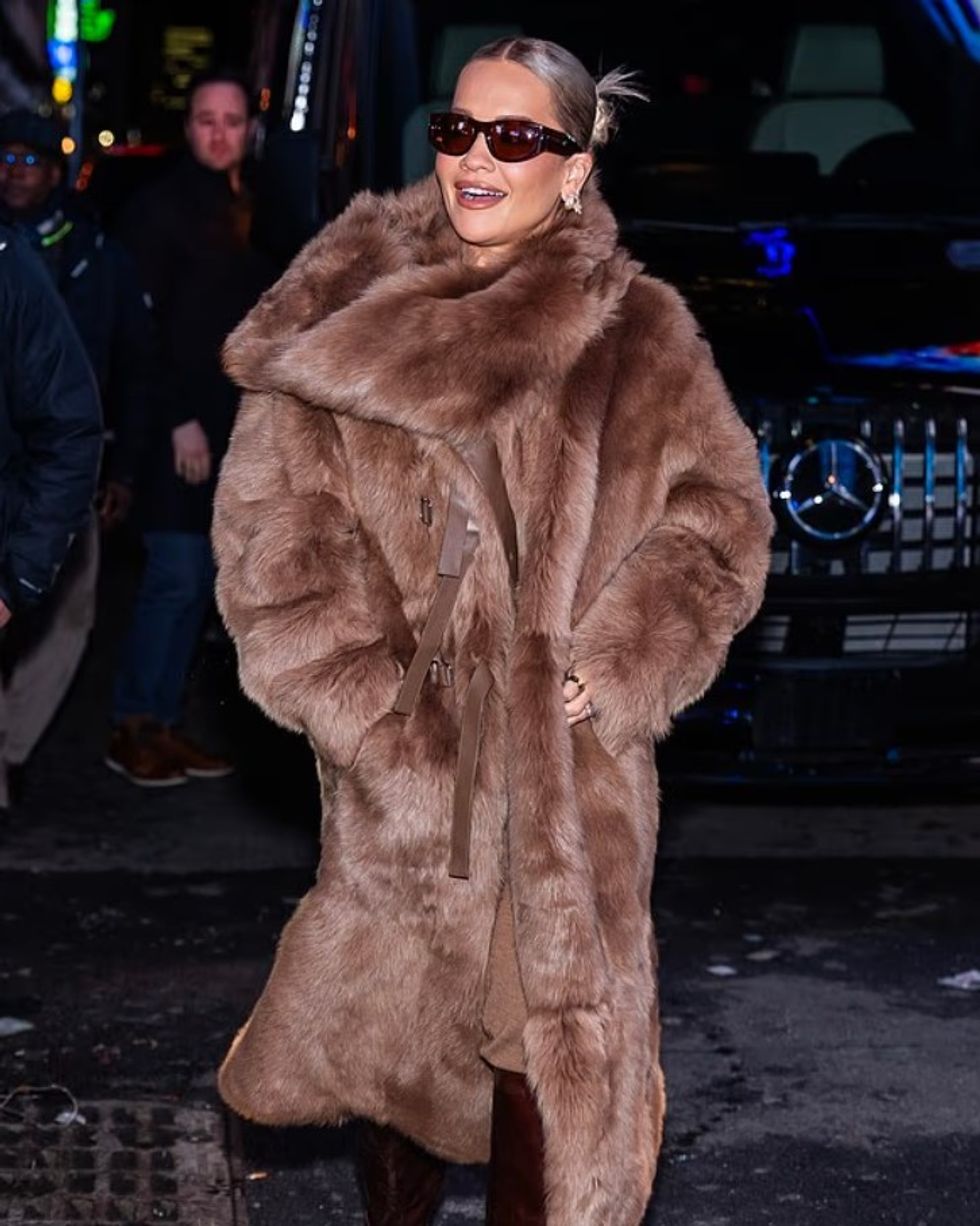 Këngëtarja 35-vjeçare u shfaq fillimisht me një pallto të gjatë prej leshi ngjyrë kafe, të shtresuar mbi një tjetër pallto të rehatshme të njëjtë, të kombinuar me çizme lëkure dhe syze dielli elegante.