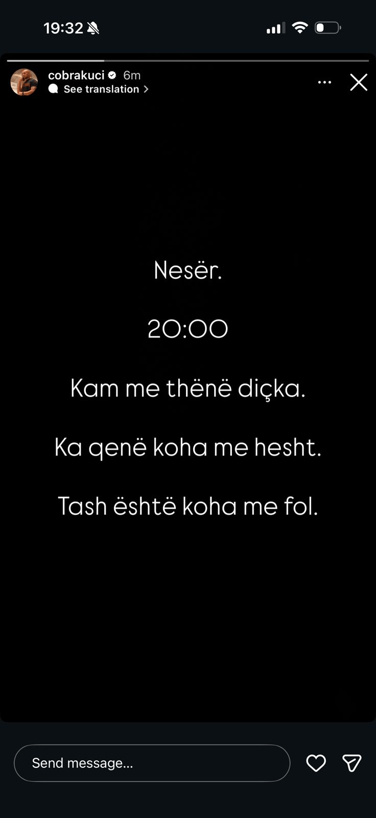 “Nesër. 20:00. Kam me thënë diçka. Ka qenë koha me hesht. Tash është koha me fol,” – shkruan ai në mesazhin e tij të shkurtër, por domethënës.
