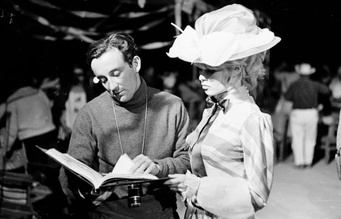 Në set gjatë xhirimeve të filmit “Viva Maria!” me regjisorin Louis Malle. Bardot luajti në këtë komedi të vitit 1965 së bashku me Jeanne Moreau.