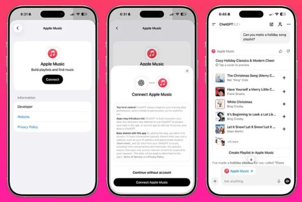 Abonentët e Apple Music mund të shtojnë këngë, albume dhe lista luajtjeje në bibliotekën e tyre përmes ChatGPT. Kur Apple Music shtohet në ChatGPT, mund të zgjidhet duke shtypur butonin "+". Listat e luajtjes dhe sugjerimet që gjeneron ChatGPT mund të hapen direkt në Apple Music.
