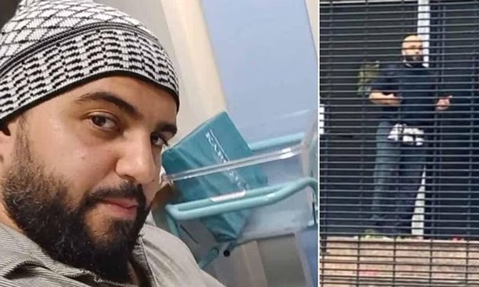 Sekonda pasi shihet duke kaluar me makinë në pamjet e reja të marra nga Daily Mail, 35-vjeçari i lindur në Siri u përpoq të hynte me forcë brenda ndërtesës ndërsa Rabbi David Walker dhe besimtarë të guximshëm bllokuan dyert.