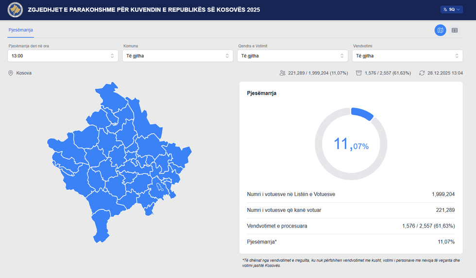 Deri në ora 13:00, 11.07 për qind e qytetarëve kanë ushtruar të drejtën për të votuar, raporton Telegrafi.