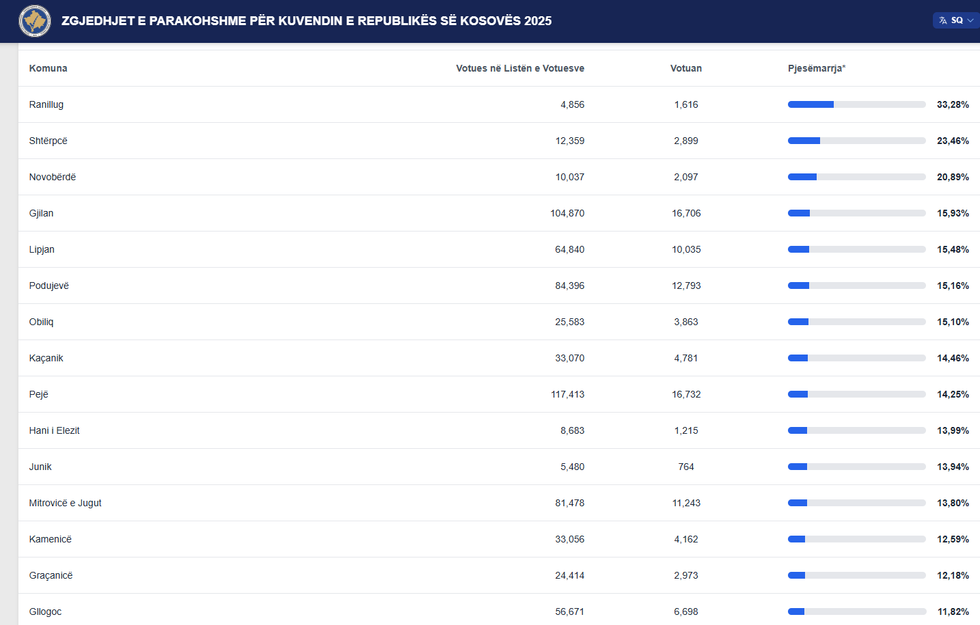 Ranillugu është komuna që prinë me daljen me të madhe, pasi 33.28 për qind e qytetarëve kanë ushtruar të drejtën për të votuar.