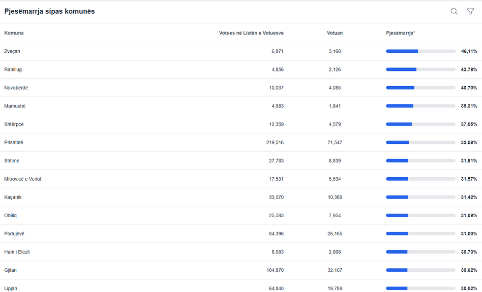 Gjilani është i katërti me daljen më të madhe votuesve, pasi kanë votuar 15.93 për qind, derisa në Lipjani kanë votuar 15.48 për qind. /Telegrafi/