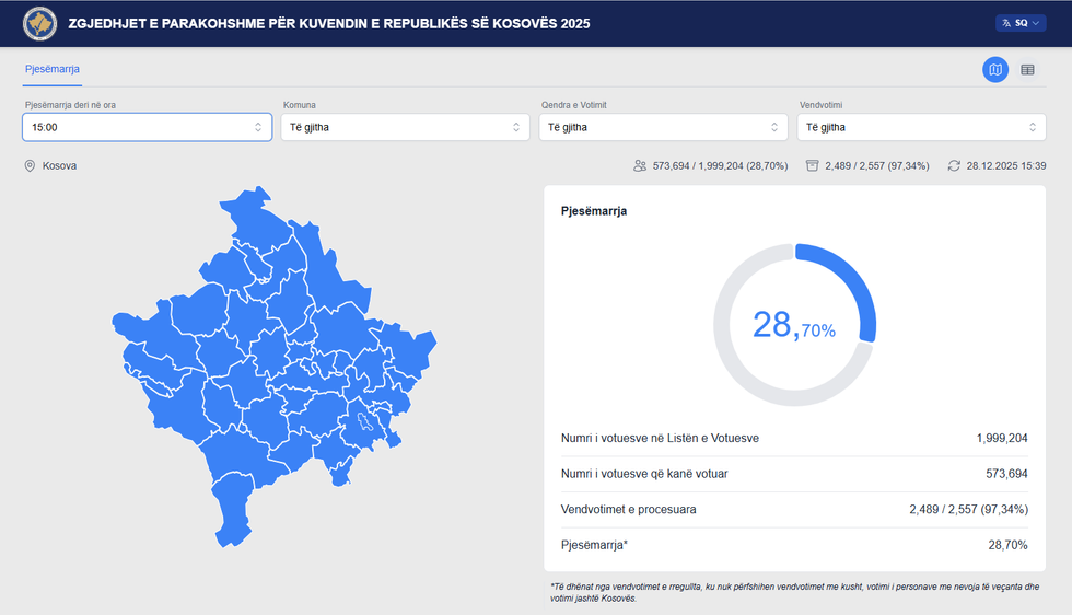 Deri në ora 15:00, 28.70 për qind e qytetarëve kanë ushtruar të drejtën për të votuar, raporton Telegrafi.