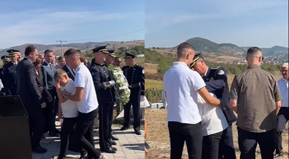 Ai shihet teksa ngushëllohet nga të pranishmit dhe zëdhënësi i policisë së Kosovës, Baki Kelani.