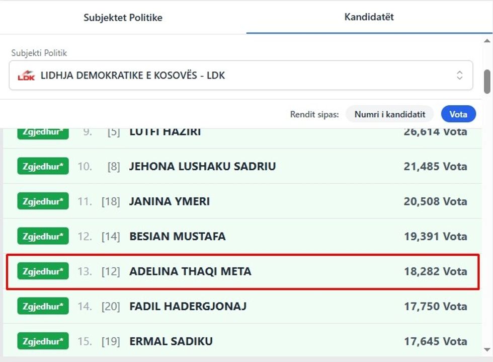 Adelina Thaqi rezultoi e 13-ta më e votuara në listën e LDK-së (Foto: KQZ)