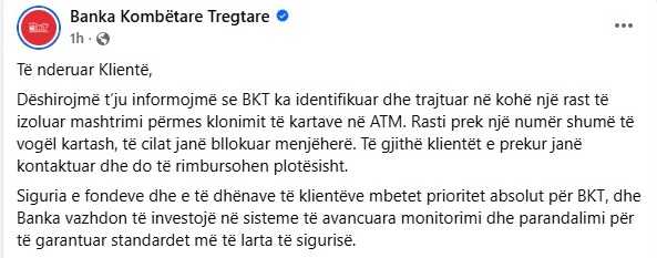 Në një njoftim publik, banka bëri me dije se ishte klonuar një numër kartash, nga të cilat janë tërhequr fondet. Të gjithë klientët e prekur janë kontaktuar dhe do të rimbursohen plotësisht, njofton BKT.