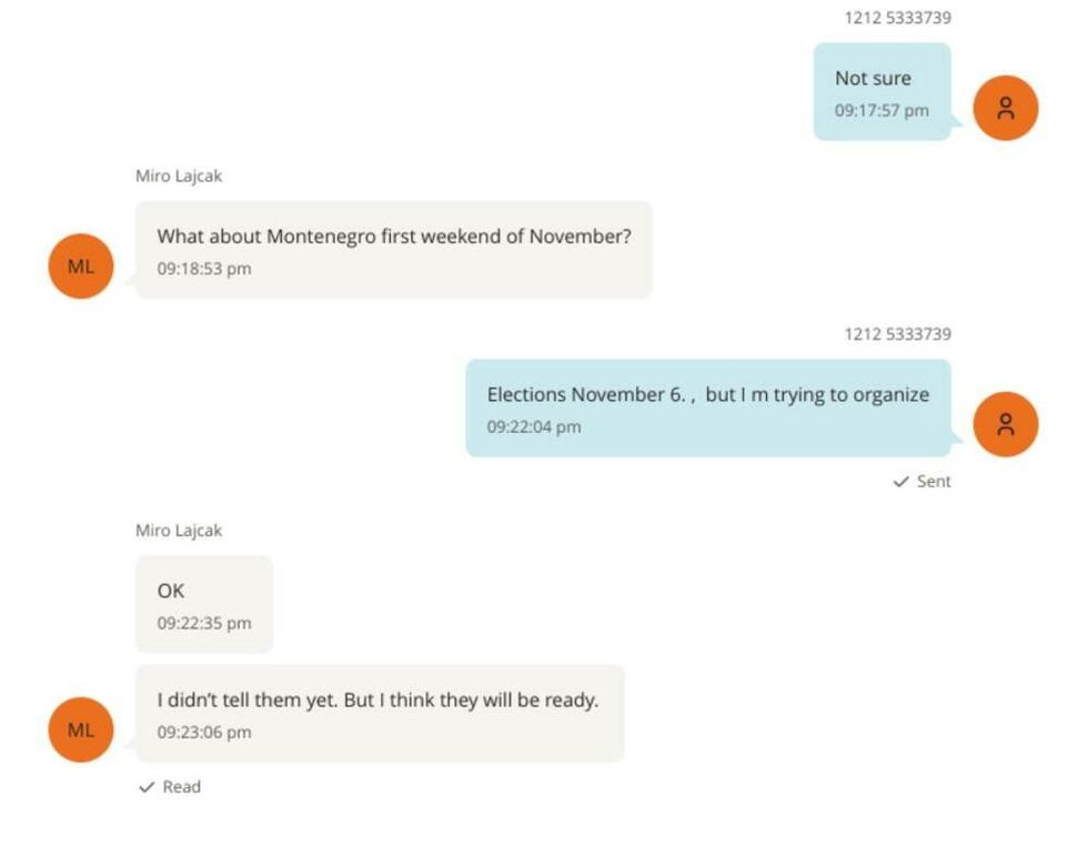Nëntë ditë më vonë, më 30 shtator 2018, Lajçak e pyet Epsteinin nëse fundjava e parë apo e dytë e nëntorit do të ishte një kohë e mirë për të vizituar Malin e Zi, dhe ai i përgjigjet: “Më lejoni të verifikoj”.