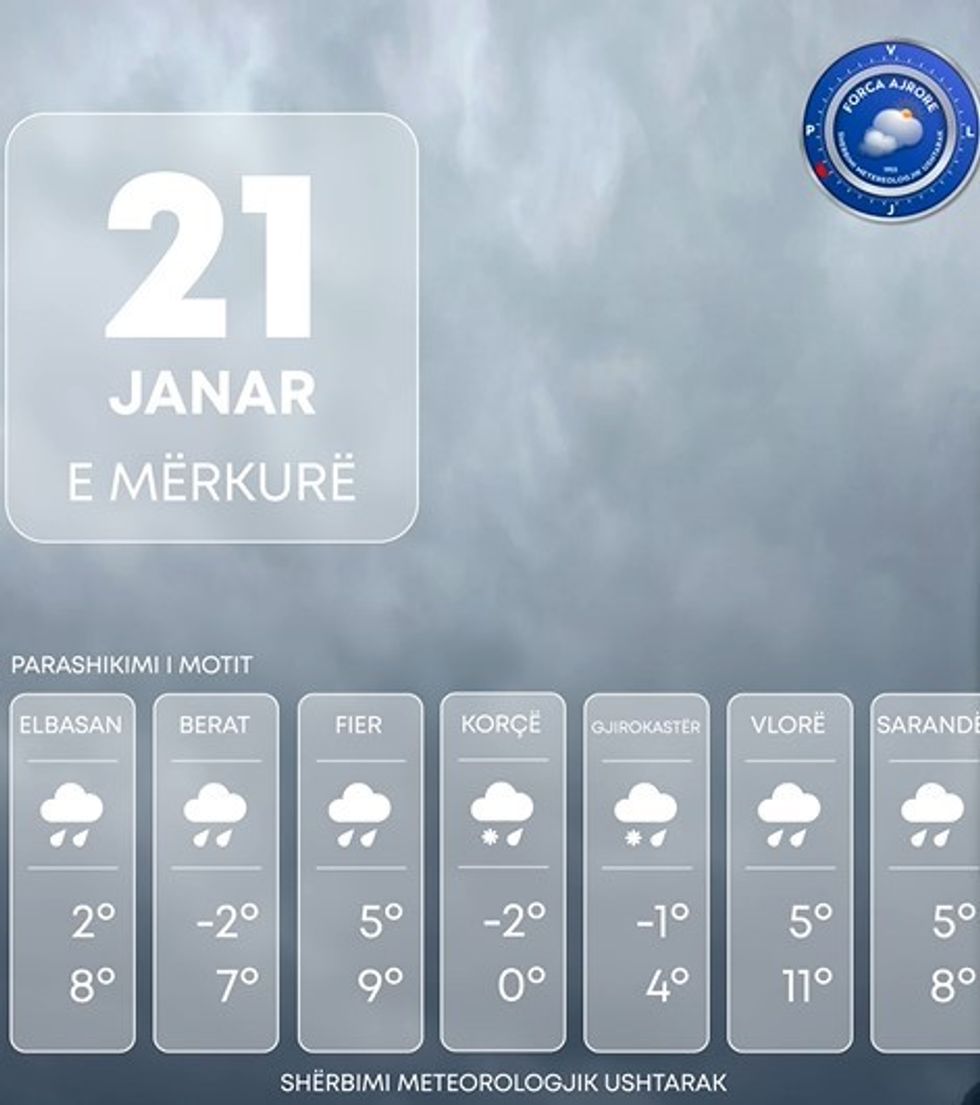 Gjatë ditës reshjet e shiut do të mbeten prezentë të herëpashershme me intensitet kryesisht të ulët, lokalisht në qendër dhe jug të vendit hera-herës reshje shiu me intensitet deri mesatar në formën e shtrëngatave.