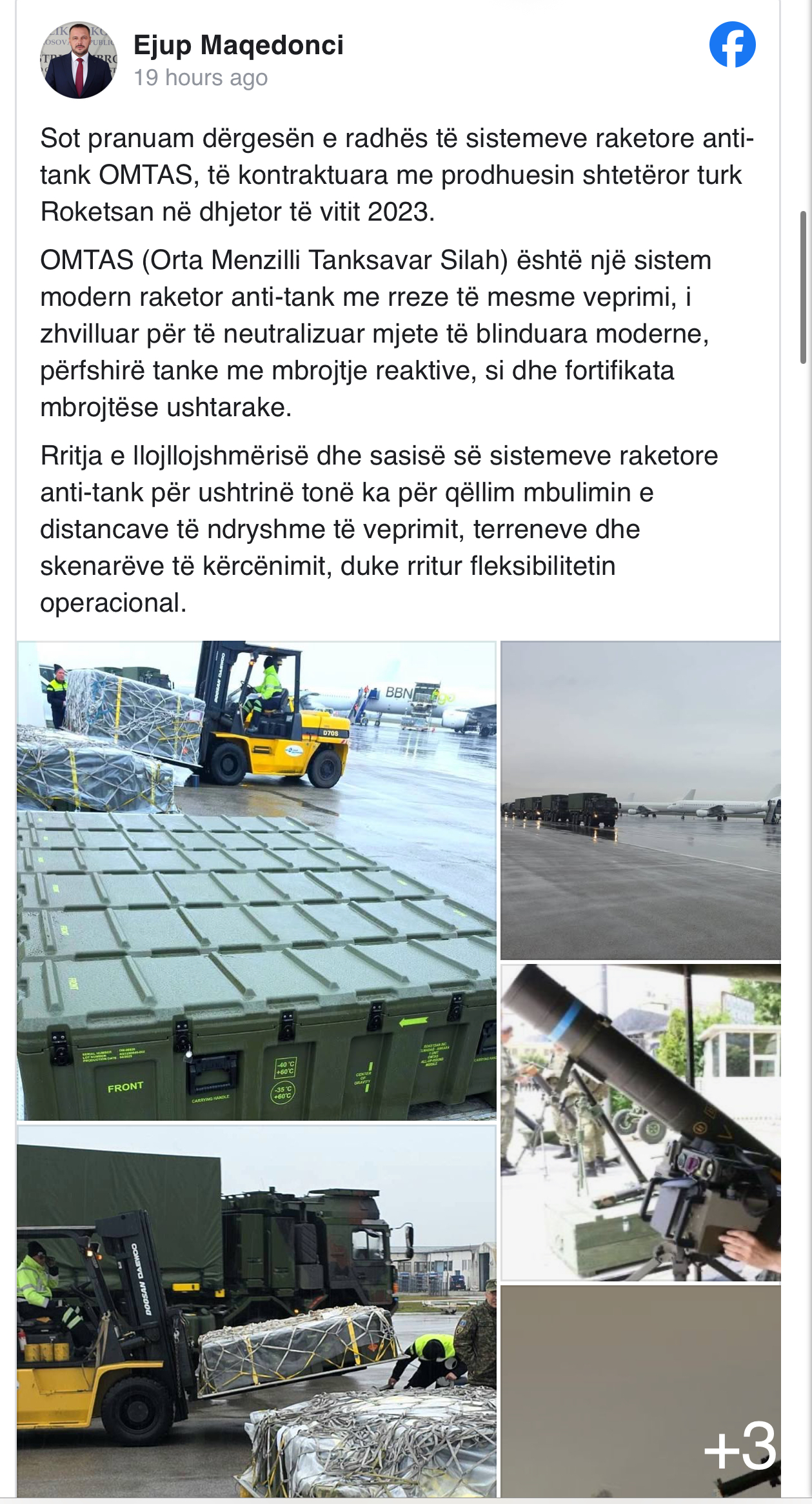 Ministri i Mbrojtjes në detyrë, Ejup Maqedonci, ka bërë të ditur se sot është pranuar dërgesa e radhës e sistemeve raketore anti-tank OMTAS, të kontraktuara me prodhuesin shtetëror turk Roketsan në dhjetor të vitit 2023.