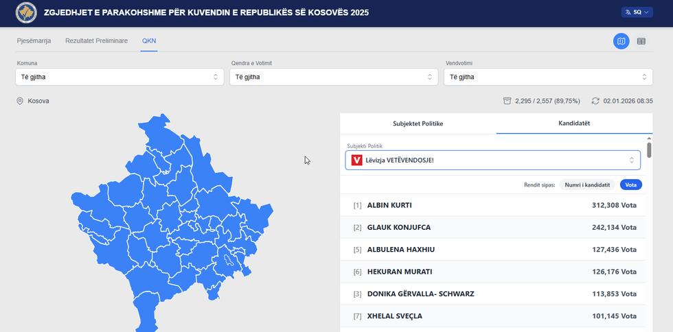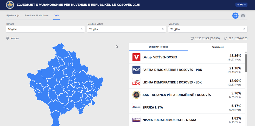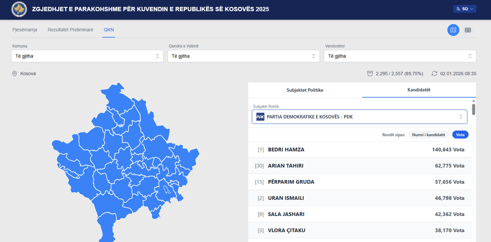 Sipas të dhënave të fundit, janë përfunduar 2,295 vendvotime nga 2,557 sa janë gjithsej, që përbën rreth 89.75 për qind të procesit të numërimit.