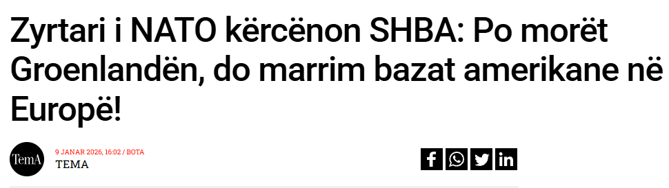 Një numër mediash shqipfolëse njoftuan më 9 janar se një zyrtar i NATO kishte kërcënuar ShBA duke thënë: “Nëse merrni Groenlandën, ne do të marrim çdo bazë amerikane nga Aviano në Ramstein, nga Rumania e të gjitha bazat e tjera ushtarake, do të konfiskohen.”