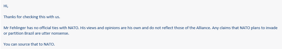 Një zyrtar i NATO përsëriti për Reuters se Fehlinger-Jahn nuk kishte lidhje zyrtare me organizatën. “Ai nuk është punonjës i NATO”, tha zyrtari. “Pikëpamjet dhe opinionet e tij janë personale dhe nuk pasqyrojnë ato të Aleancës. Gjithashtu, pavarësisht titullit – ‘Komiteti Evropian për Zgjerimin e NATO-s’ – ky nuk është një komitet apo organ i NATO.”