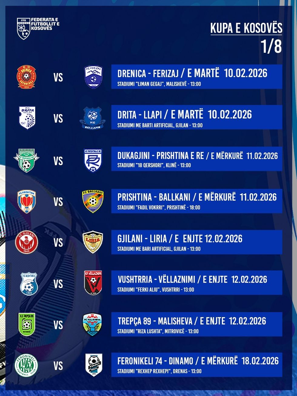 Federata e Futbollit e Kosovës ka publikuar orarin e ndeshjeve të 1/8 së finales në Kupën e Kosovës, të cilat do të zhvillohen gjatë kësaj jave.