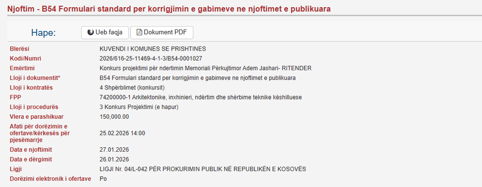 Komuna e Prishtinës ka shpallur konkurs publik për projektimin e një memoriali përkujtimor kushtuar komandantit legjendar Adem Jashari dhe sakrificës së familjes së tij, me një buxhet të parashikuar prej 150 mijë eurosh.