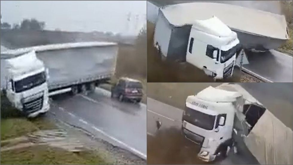 A truck skidded on the wet road, overturned, and slammed into an oncoming car.