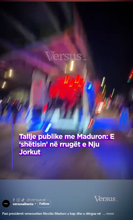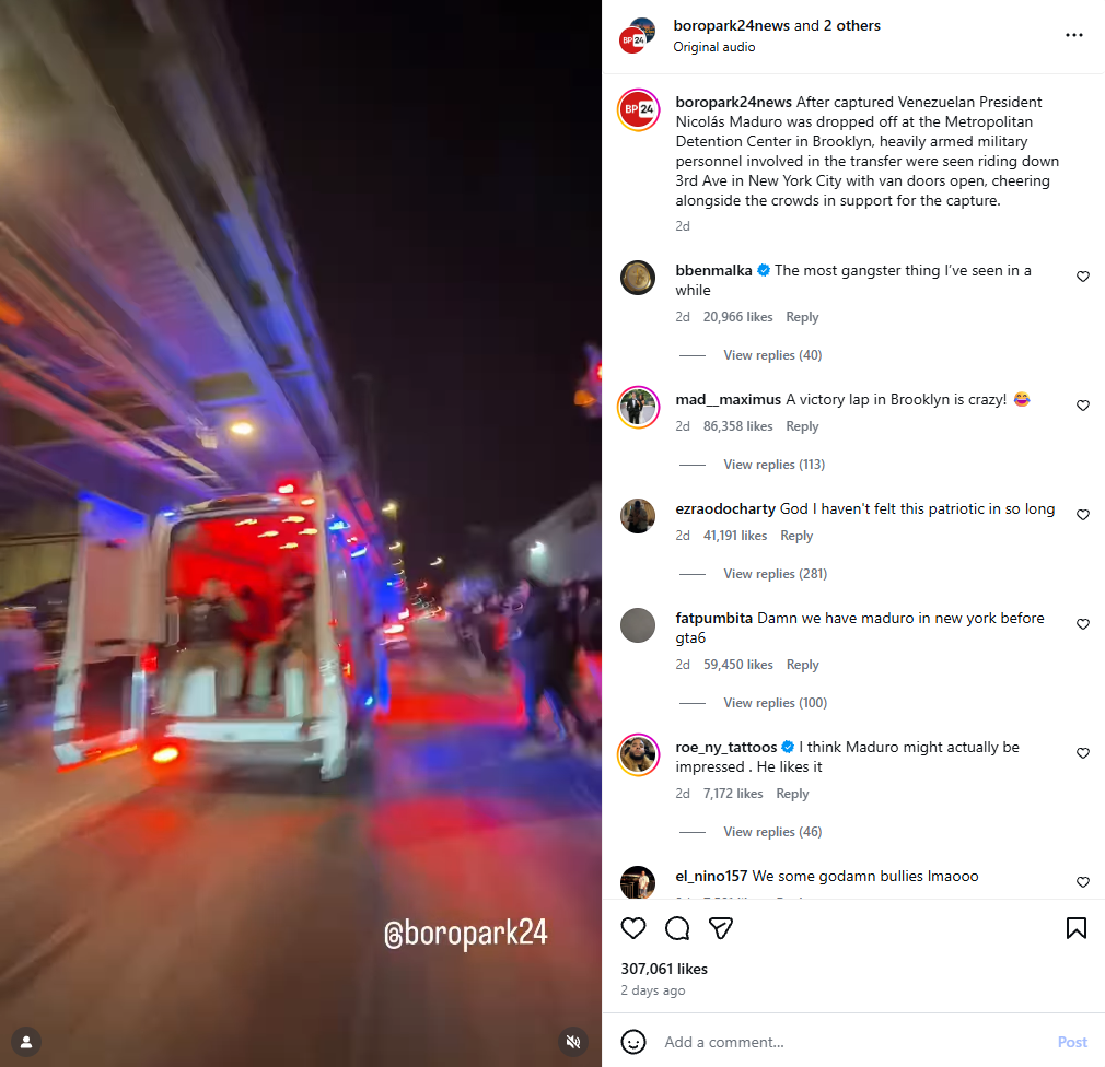 Postimi shoqërohet me përshkrimin: “Pas transferimit të Presidentit të Venezuelës të kapur Nicolás Maduro në Qendrën Metropolitan të Paraburgimit në Brooklyn, personeli ushtarak i armatosur rëndë i përfshirë në transport u pa duke ngarë furgonë me dyer të hapura në Avenue 3rd në New York, duke brohoritur së bashku me një turmë që mbështeste kapjen e tij.” Postimi nuk përmend nëse Maduro ishte në furgonin e bardhë.