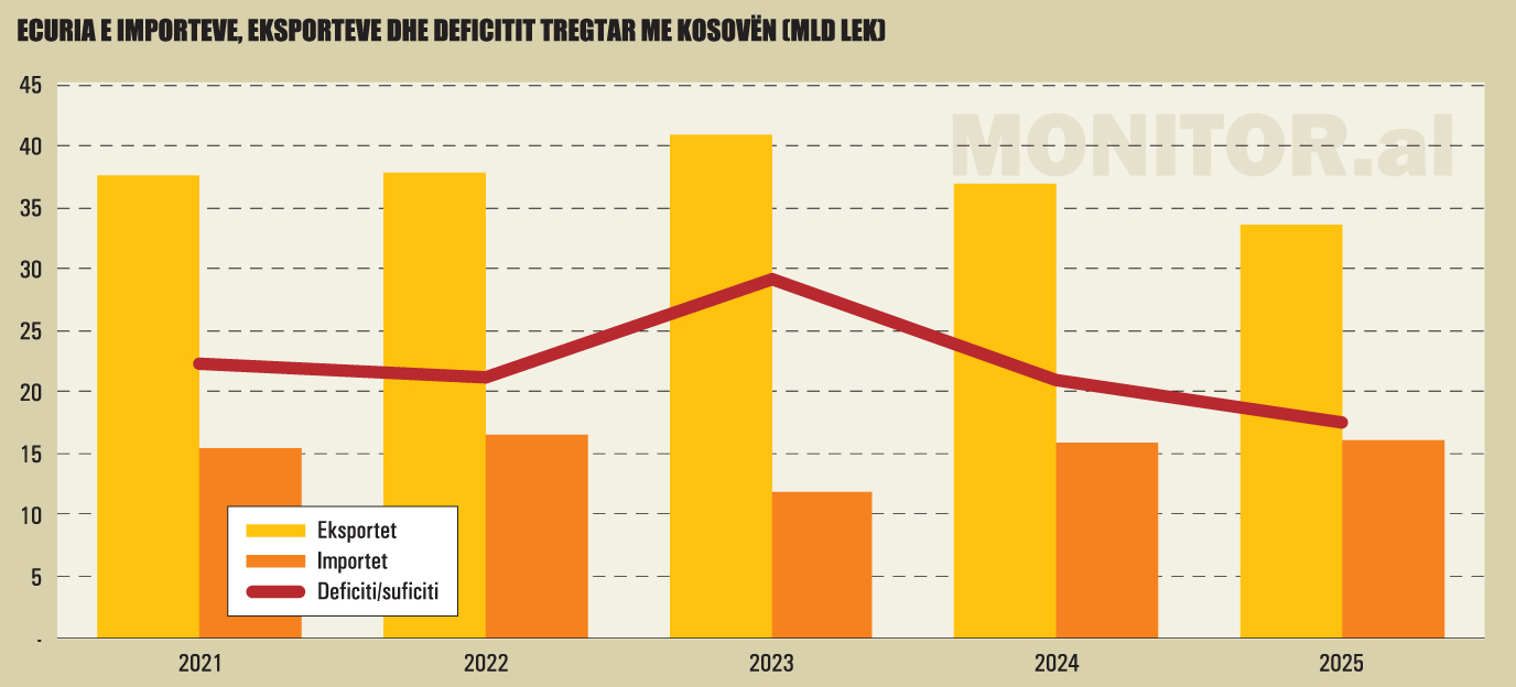 Si pasojë, suficiti tregtar i Shqipërisë me Kosovën ra në 17.52 miliardë lekë në vitin 2025, nga 21.07 miliardë lekë në vitin 2024, një përkeqësim prej 3.54 miliardë lekësh, ose mbi 20%, brenda vetëm një viti.