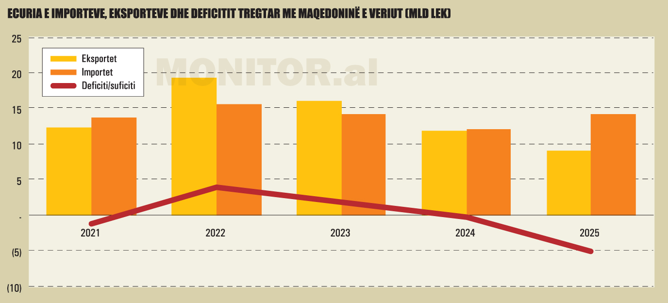 Në vitet 2022 dhe 2023, Shqipëria kishte epërsi në tregtinë me Maqedoninë e Veriut, por e humbi këtë avantazh në dy vitet në vijim. Bilanci tregtar u përkeqësua ndjeshëm. Nga një deficit relativisht i moderuar prej 261 milionë lekësh në vitin 2024, Shqipëria kaloi në një deficit të thellë prej 5.09 miliardë lekësh në vitin 2025, një përkeqësim prej mbi 4.8 miliardë lekësh brenda një viti.