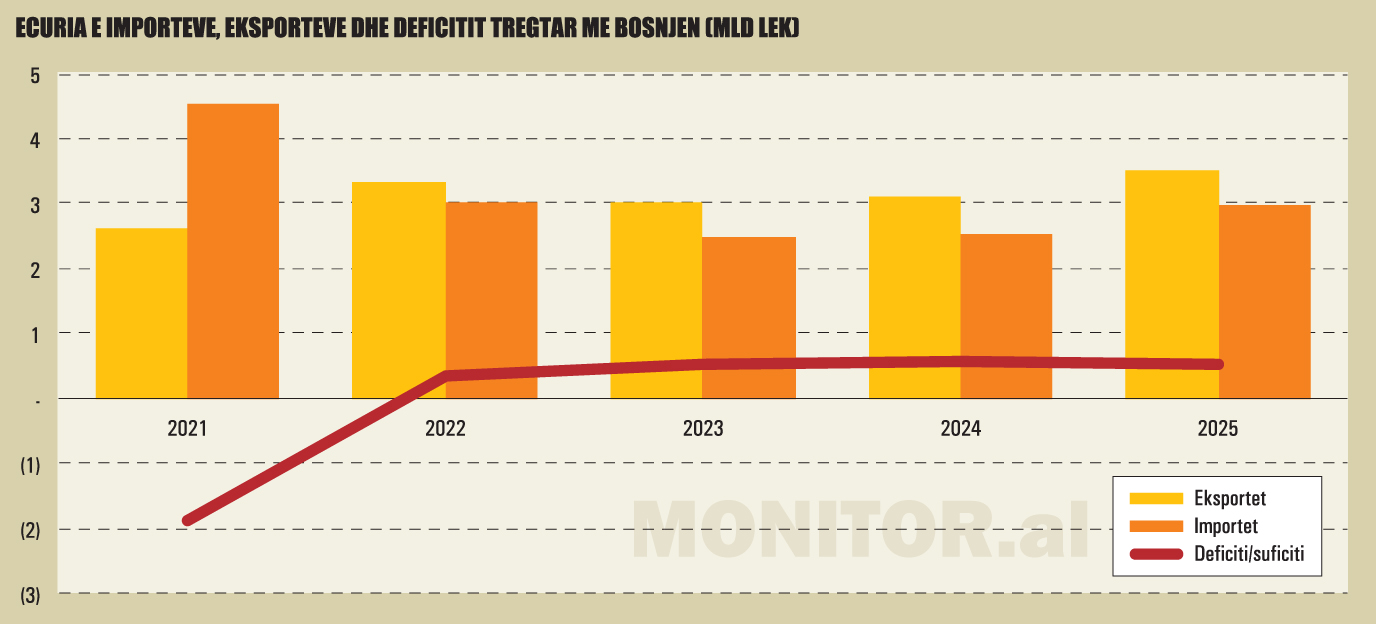 Në vitin 2025, eksportet shqiptare drejt Bosnjës u rritën në 3.5 miliardë lekë, nga 3.1 miliardë lekë në vitin 2024, një rritje prej 13.1%. Por kjo rritje nuk mjaftoi për të kompensuar rritjen edhe më të shpejtë të importeve nga Bosnja drejt vendit tonë Importet nga Bosnja arritën në 2.9 miliardë lekë në vitin 2025, nga 2.5 miliardë lekë një vit më parë, duke u rritur me 19%.