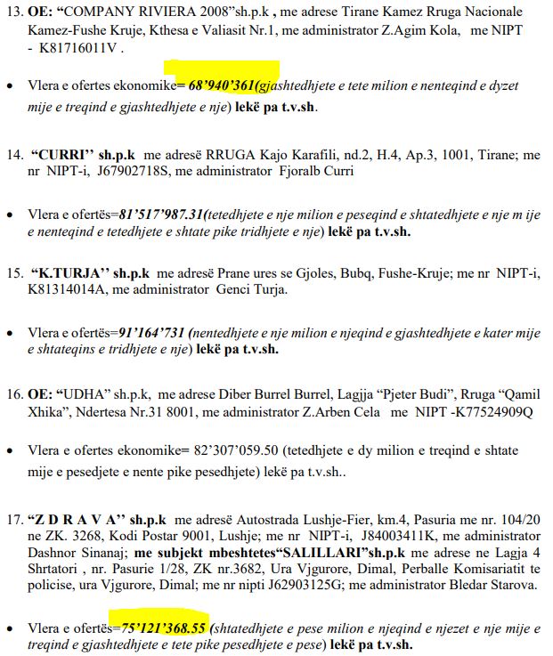 Zyrtarisht, kompania fituese Ă«shtĂ« âZ D R A V Aââ sh.p.k me pronar Dashnor Sinanajn, ortak nĂ« shumĂ« tendera me PĂ«llumb Salillarin. Vlera e ofertĂ«s sĂ« paraqitur Ă«shtĂ« 75â121â368.55 (shtatĂ«dhjetĂ« e pesĂ« milion e njĂ«qind e njĂ«zet e njĂ« mijĂ« e treqind e gjashtĂ«dhjetĂ« e tetĂ« pikĂ« pesĂ«dhjetĂ« e pesĂ«) lekĂ« pa t.v.sh. Subjekti mbĂ«shtetes Ă«shtĂ« âSALILLARIâsh.p.k.