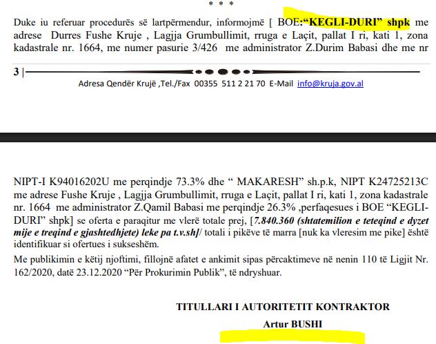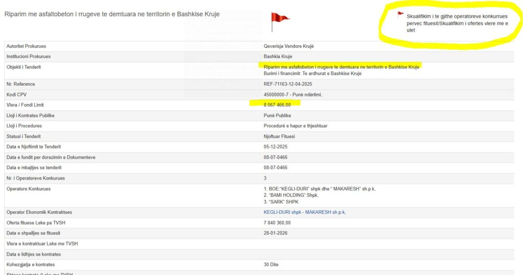 Edhe ky tender ka merituar âFlamur tĂ« kuqâ pĂ«r riskun e korrupsionit. Bashkimi i firmave âKEGLI-DURIâ shpk dhe MAKARESH sh.p.k, me bazĂ« nĂ« FushĂ« KrujĂ«, janĂ« shpallur fitues, megjithĂ«se nuk ishte oferta mĂ« e ulĂ«t.