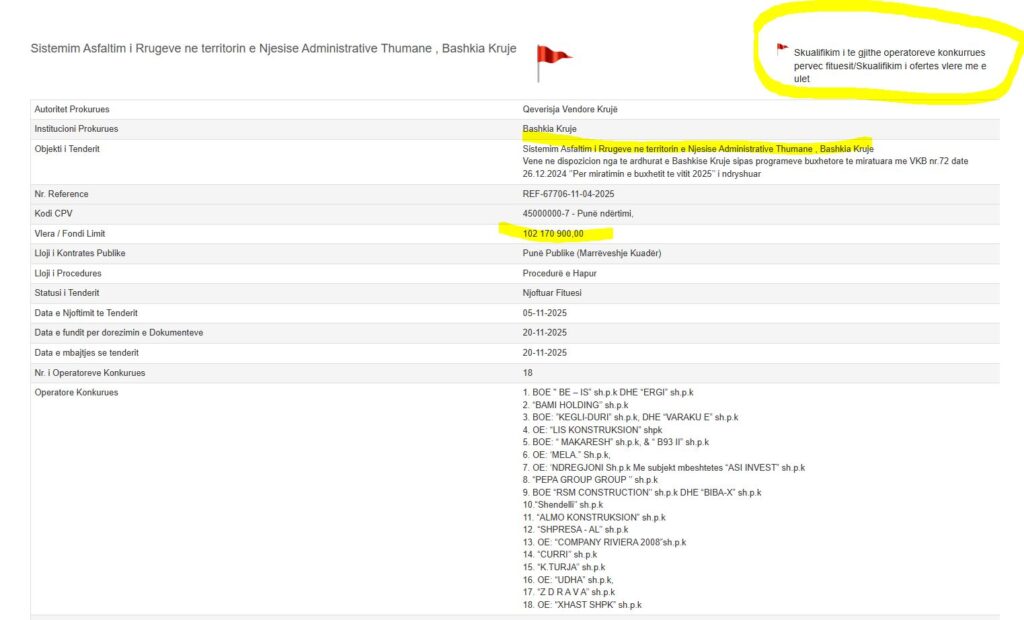 Tenderi Ă«shtĂ« mbajtur nĂ« 20 nĂ«ntor 2025 dhe kanĂ« marrĂ« pjesĂ« 18 operatorĂ« konkurrues. Gjithsesi, loja luhet nga 4-5 kompani qĂ« ndĂ«rrojnĂ« vendet nga fituese nĂ« humbĂ«se nĂ« renditjet e komisionit nĂ« tenderat e asfaltit. KĂ«to janĂ« firmat e miqve tĂ« kryebashkiakut: âKEGLI-DURIâ, âBAMI HOLDINGââ, â MAKARESHâ, âUDHAâ, âZ D R A V Aââ dhe âSalillariâ.