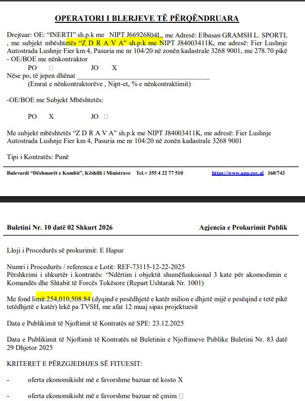 NdĂ«rsa mĂ« 25 janar 2026, âZ D R A V Aâ sh.p.k ka firmosur kontratĂ« si subjekt mbĂ«shtetĂ«s nĂ« tenderin âNdĂ«rtim i objektit shumĂ«funksional 3 kate pĂ«r akomodimin e KomandĂ«s dhe Shtabit tĂ« ForcĂ«s TokĂ«sore (Repart Ushtarak Nr. 1001). Fondi limit i caktuar nga Ministria e Mbrojtjes dhe i prokuruar nga Operatori i Blerjeve tĂ« PĂ«rqendruara Ă«shtĂ« 254,010,508.84 lekĂ« pa TVSH.