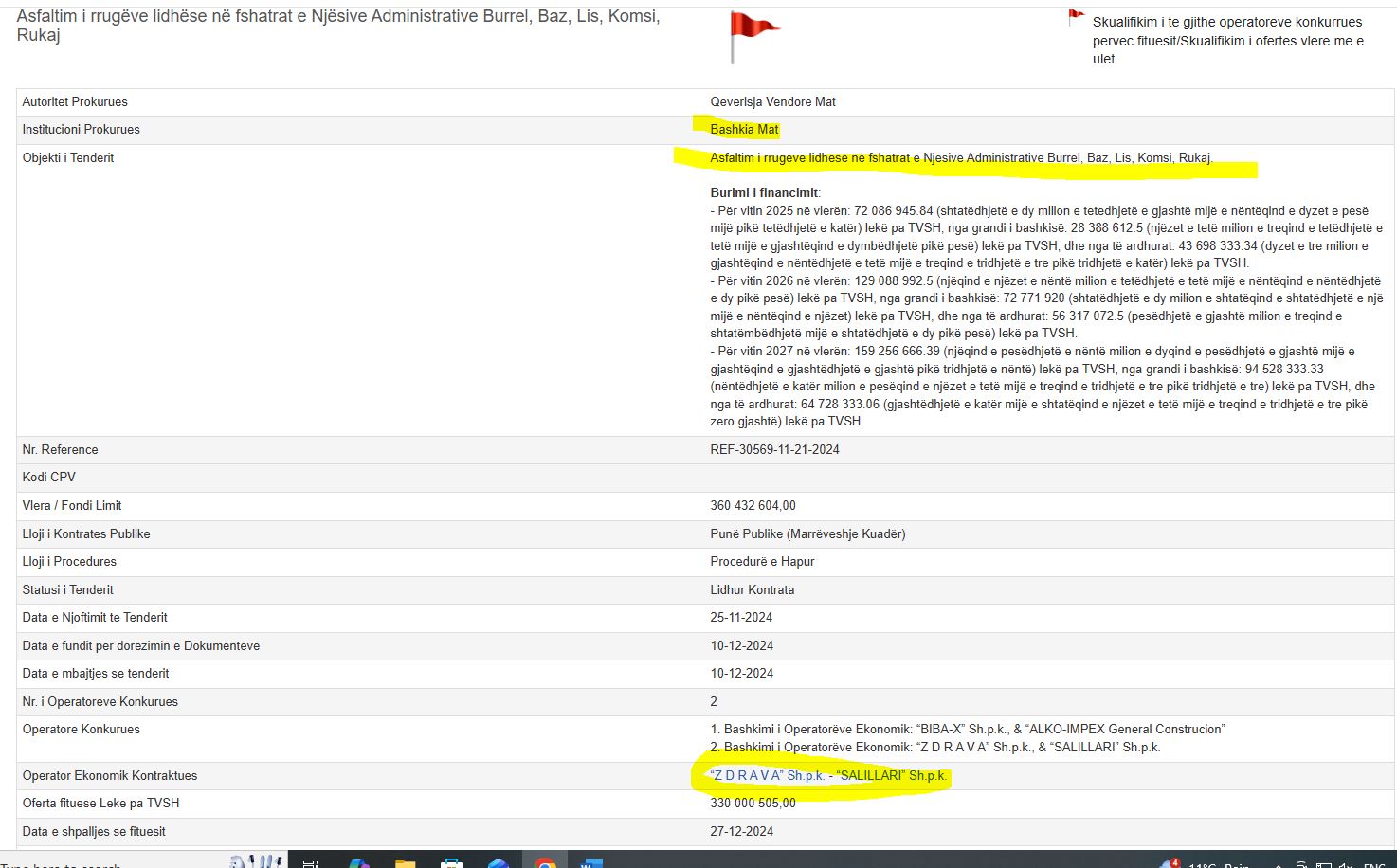 KĂ«shtu, dy javĂ« para se tĂ« merrnin tenderin nga Bushi, mĂ« 16 Janar 2026, âSalillariâ dhe âZDRAVAâ dhe do tĂ« firmosnin kontratĂ«n me kohĂ«zgjatje 2 vjet me BashkinĂ« Mat. Objekti i prokurimit edhe nĂ« kĂ«tĂ« rast Ă«shtĂ« asfaltim. NĂ« tenderin âAsfaltimi i rrugĂ«ve lidhĂ«se nĂ« fshatrat e NjĂ«sive Administrative Burrel, Baz, Lis, Komsi, Rukajâ, dy firmat kanĂ« marrĂ« fondin limit 360 432 604,00 lekĂ« pa TVSH.