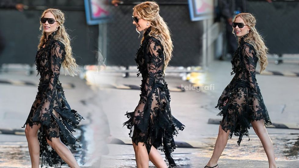 Aktorja 35-vjeçare, e cila luan përkrah Jacob Elordi si Heathcliff, veshi një fustan dramatik të zi transparent me dantella, të kombinuar me taka të larta dhe syze të errëta.