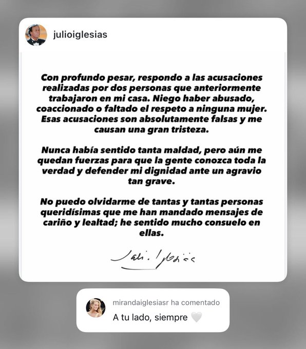 Këngëtari spanjoll nuk hezitoi t’i vinte në qendër të vëmendjes dy ankueset: “Nuk kisha ndjerë kurrë kaq shumë të keqe, por ende kam forcën t’ua tregoj njerëzve të gjithë të vërtetën dhe të mbroj dinjitetin tim përballë një ankese kaq serioze.”