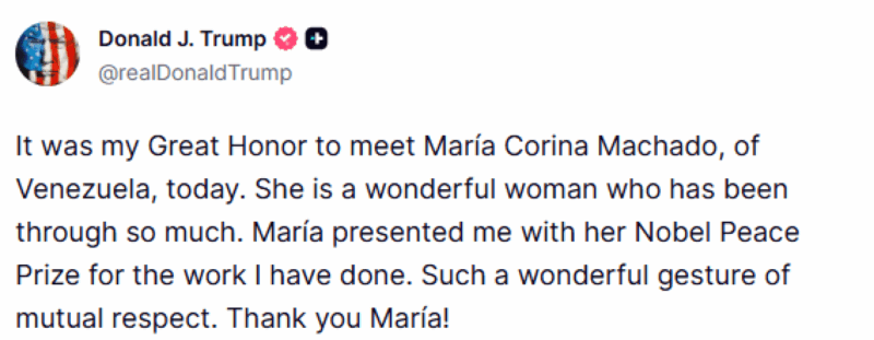 NjĂ« takim shumĂ« simbolik u zhvillua nĂ« ShtĂ«pinĂ« e BardhĂ« tĂ« enjten, ku udhĂ«heqĂ«sja e opozitĂ«s venezueliane, Maria Corina Machado, i ofroi Donald Trump Ămimin Nobel pĂ«r Paqen, i cili iu dha nĂ« dhjetor, njĂ« veprim qĂ« shkaktoi debat dhe reagime ndĂ«rkombĂ«tare. NĂ« njĂ« postim nĂ« rrjetet sociale, presidenti amerikan shkroi: