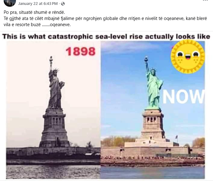 Dy foto të Statujës së Lirisë në Nju Jork, të cilat pretendohet se janë bërë me më shumë se 100 vjet diferencë, po qarkullojnë në rrjete sociale me pretendimin se ato janë prova të mjaftueshme për të vërtetuar se nuk ka patur ndonjë rritje të ndjeshme të nivelit të detit, një pasojë e njohur e ngrohjes globale.