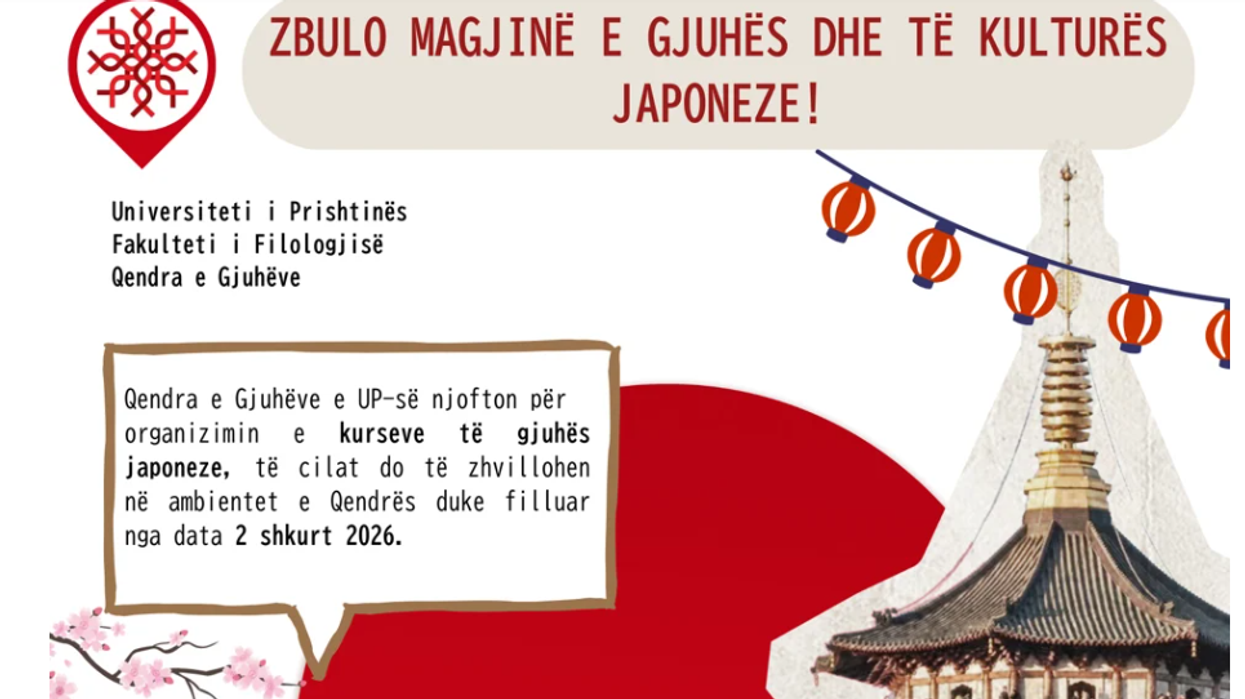 “KĂ«to kurse do tĂ« mbahen nga lektorĂ« japonezĂ« nĂ« ambientet e QendrĂ«s sĂ« GjuhĂ«ve tĂ« UP-sĂ« dhe u dedikohen studentĂ«ve, personelit akademik dhe administrativ tĂ« Universitetit tĂ« PrishtinĂ«s, ndĂ«rsa janĂ« tĂ« hapura edhe pĂ«r tĂ« gjithĂ« ata qĂ« dĂ«shirojnĂ« tĂ« pĂ«rfitojnĂ« njohuri tĂ« reja gjuhĂ«sore dhe kulturore duke mĂ«suar gjuhĂ«n japoneze”, njofton UP, mĂ« 21.01.2026.