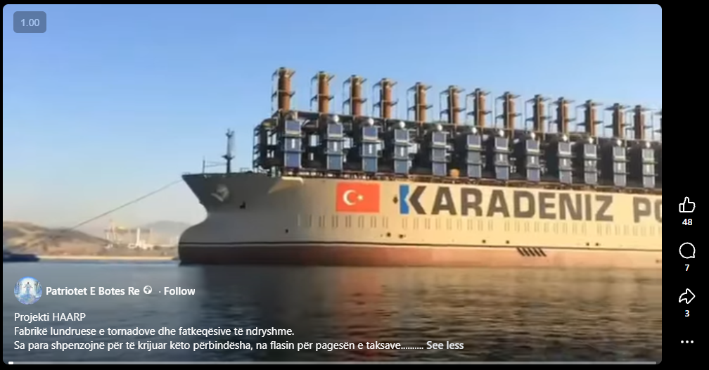 Video e një anijeje që po qarkullon në rrjete sociale, përfshi ato shqipfolëse, pretendohet se tregon famëkeqin projektin HAARP, një “fabrikë lundruese e tornadove dhe fatkeqësive të ndryshme.”