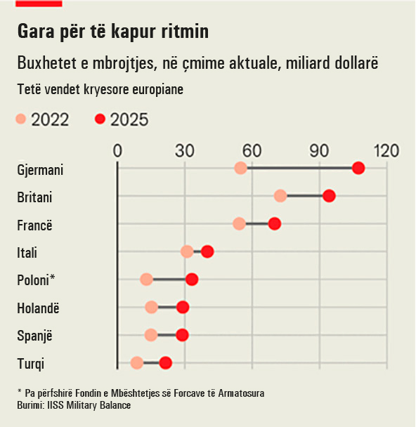Trump ka inkurajuar aleatët të rrisin shpenzimet për mbrojtje, me një objektiv afatgjatë që ata të arrijnë 5% të PBB-së së tyre deri në vitin 2035. Aktualisht, asnjë vend anëtar nuk ka arritur këtë nivel. Polonia, që shpenzon më shumë për mbrojtje në raport me PBB-në, ka shpenzuar pak më pak se 4.5% në vitin 2025, ndërsa SHBA-të rreth 3.22%./mxh