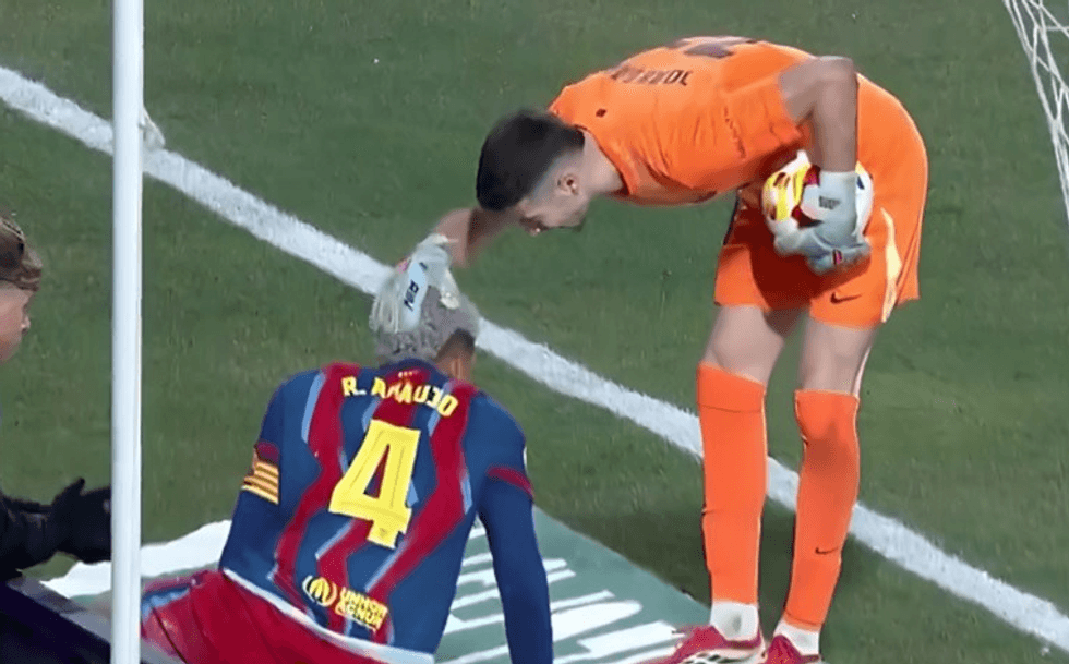 Portieri i Barcelonës, Joan Garcia, kapi topin, por më pas, duke e mbajtur në duar, shkoi drejt vijës së fundit për të kontrolluar shokun e skuadrës, Ronald Araujo, i cili ishte shtrirë.