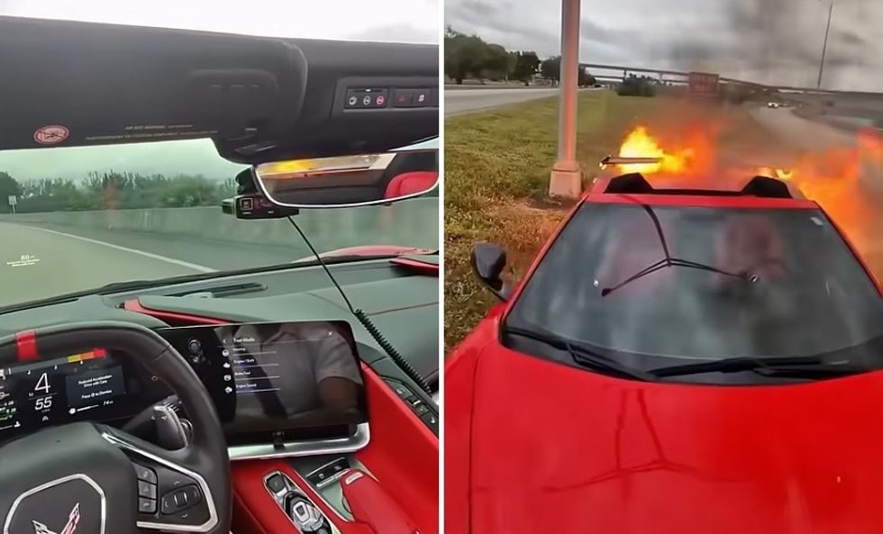 @lamstorytime The video shows a first-person perspective of a driver in a red Chevrolet Corvette C8 convertible. While driving on a highway, the driver notices smoke and pulls over to the shoulder. Upon exiting the vehicle, the rear engine bay is seen engulfed in large flames and thick black smoke. The driver quickly grabs a few personal items from the passenger seat before backing away as the fire intensifies. #accident#cartok#viral⏠My Freedom - ROIK