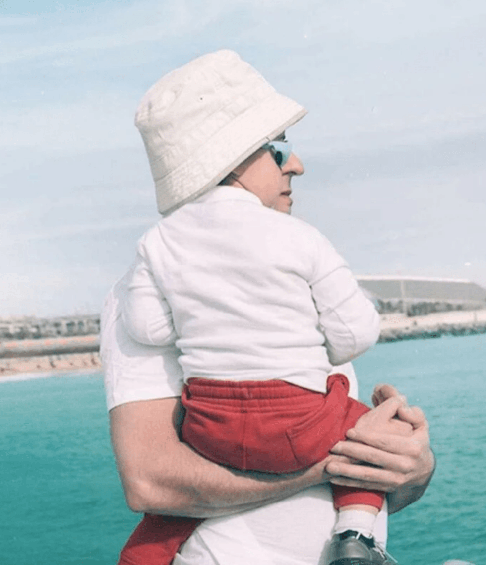 Fotografia duket se tregon një fëmijë me një bluzë të bardhë dhe pantallona të kuqe, të mbajtur nga një burrë që mban një bluzë të bardhë.